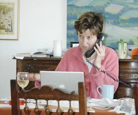 Sitting at my work desk (aka dining table) in our sabbatical apartment in Aix-en-Provence, 2008. Note that my laptop is joined by both wine and coffee. I’m probably speaking French on the phone, which always filled me with terror, because my French was never up to the task of a phone call.