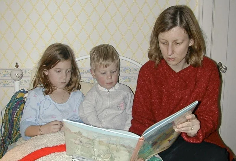 Reading to my own kids in about 2001. I wish I knew what the book was. Let me know if you can identify it from its cover!